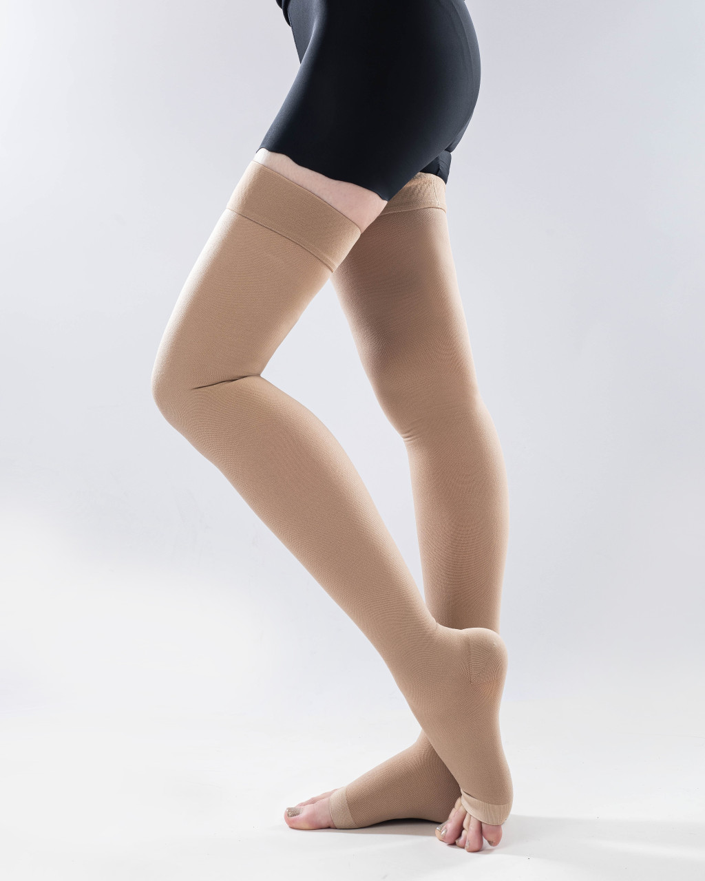 Az AG kompressziós harisnya a bokától egészen a combtőig fokozatos nyomást biztosít, ezzel elősegíti a vénás keringést és tehermentesíti az alsó végtagokat.